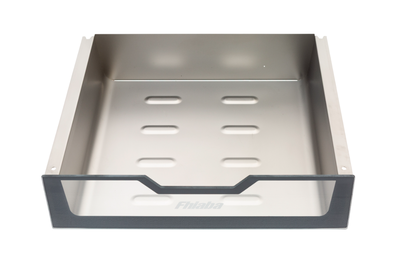 Cassetto in acciaio inox Aisi 304 micropallinato con frontale in vetro temperato da 6 mm ad estrazione totale (capacità 10,5 L. ). Ideale per la conservazione alimenti freschi, frutta e verdura.