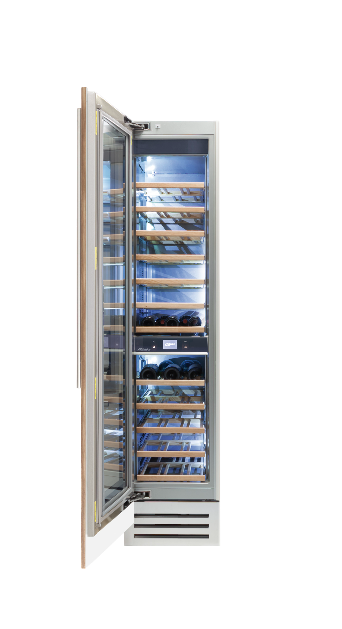 Le cantine vini Fhiaba sono dotate di pregiati ripiani in legno noce canaletto realizzati da artigiani friulani. Sfruttano ogni minimo spazio del vano e accolgono bottiglie con diverse dimensioni e sono completamente estraibili e dotati di chiusura soft per ridurre le vibrazioni.