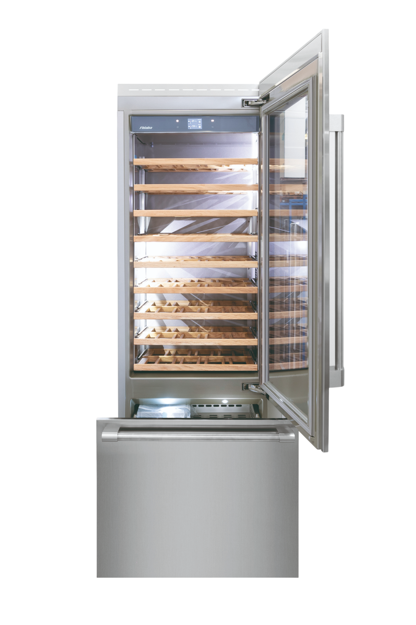Le cantine vini Fhiaba sono dotate di pregiati ripiani in legno noce canaletto realizzati da artigiani friulani. Sfruttano ogni minimo spazio del vano e accolgono bottiglie con diverse dimensioni e sono completamente estraibili e dotati di chiusura soft per ridurre le vibrazioni.