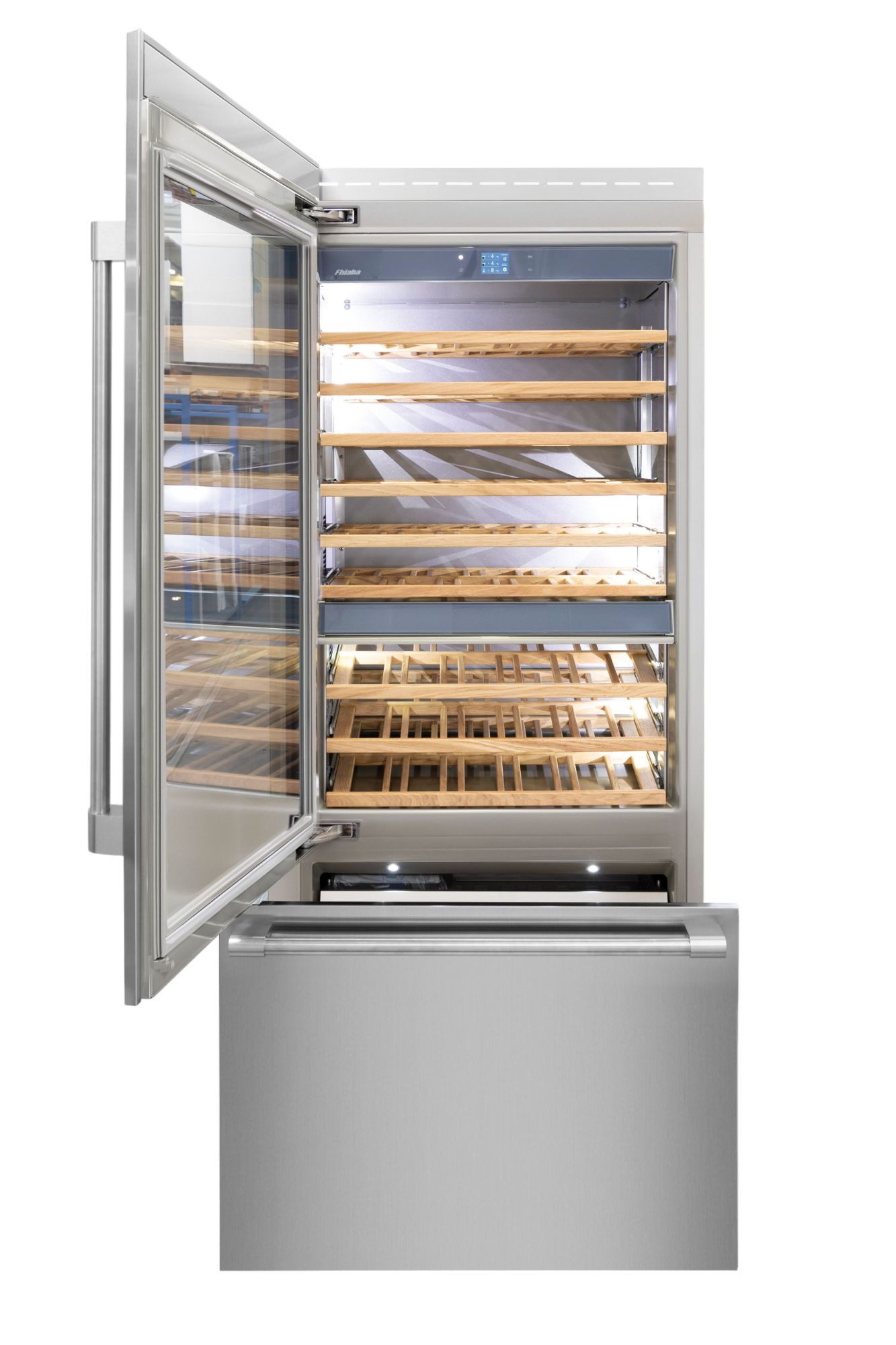 Le cantine vini Fhiaba sono dotate di pregiati ripiani in legno noce canaletto realizzati da artigiani friulani. Sfruttano ogni minimo spazio del vano e accolgono bottiglie con diverse dimensioni e sono completamente estraibili e dotati di chiusura soft per ridurre le vibrazioni.