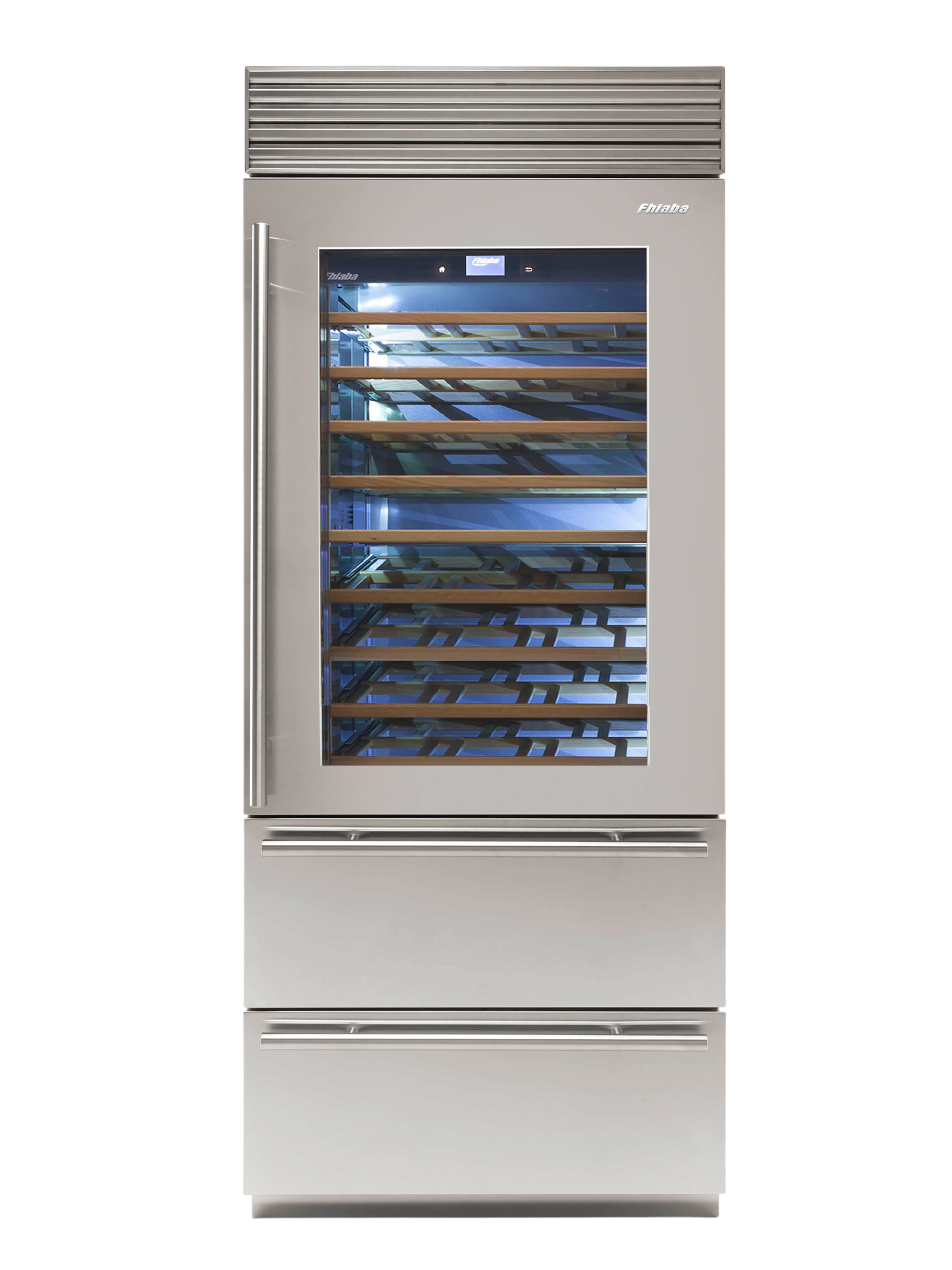 Le porte in vetro brunito Fhiaba hanno tre strati per filtrare i raggi UV e proteggere le bottiglie di vino dai epentini cambiamenti di temperatura e umidità dell'ambiente esterno.