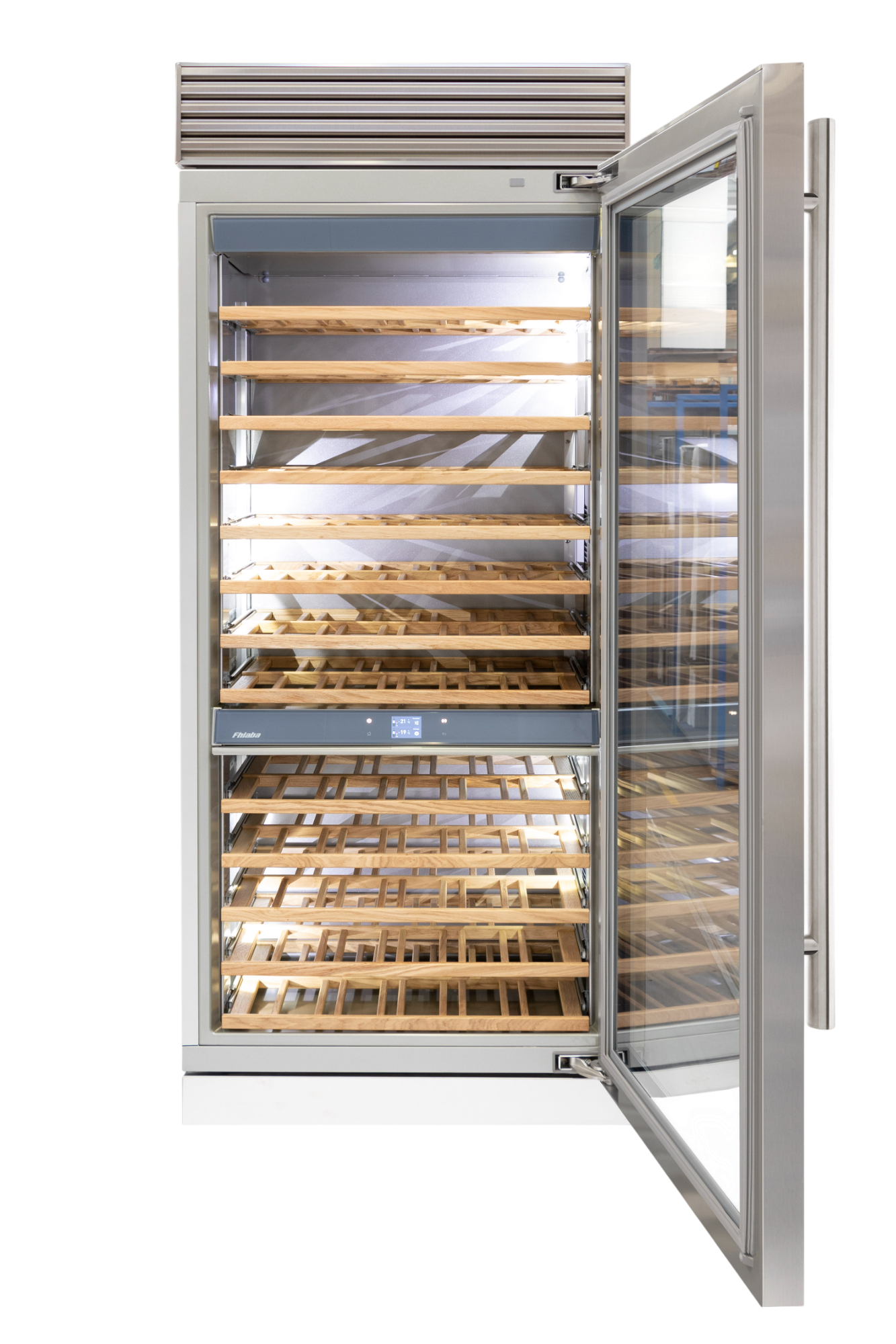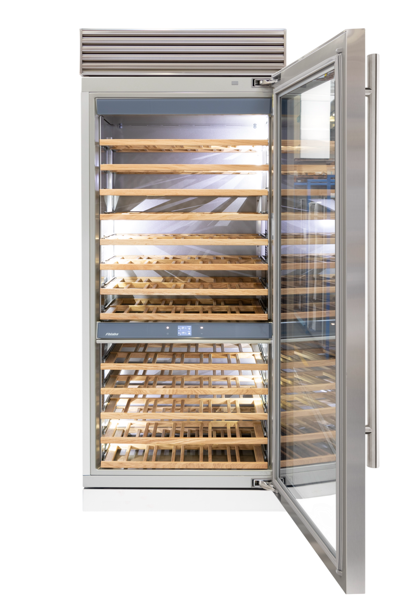 Le cantine vini Fhiaba sono dotate di pregiati ripiani in legno noce canaletto realizzati da artigiani friulani. Sfruttano ogni minimo spazio del vano e accolgono bottiglie con diverse dimensioni e sono completamente estraibili e dotati di chiusura soft per ridurre le vibrazioni.