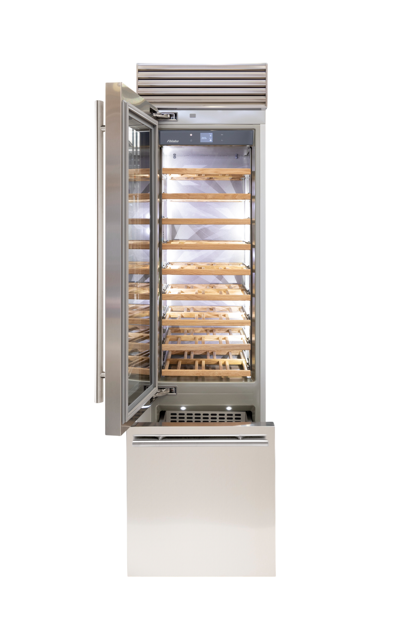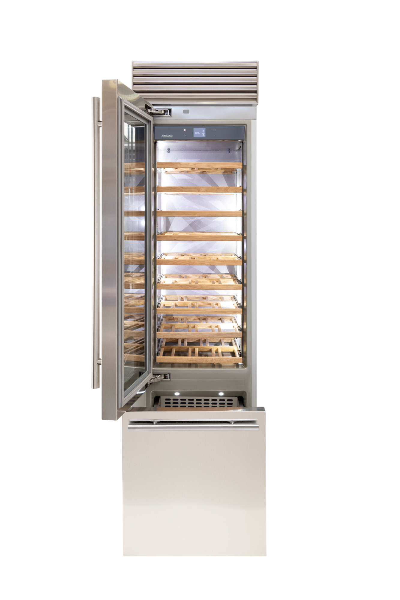 Le cantine vini Fhiaba sono dotate di pregiati ripiani in legno noce canaletto realizzati da artigiani friulani. Sfruttano ogni minimo spazio del vano e accolgono bottiglie con diverse dimensioni e sono completamente estraibili e dotati di chiusura soft per ridurre le vibrazioni.
