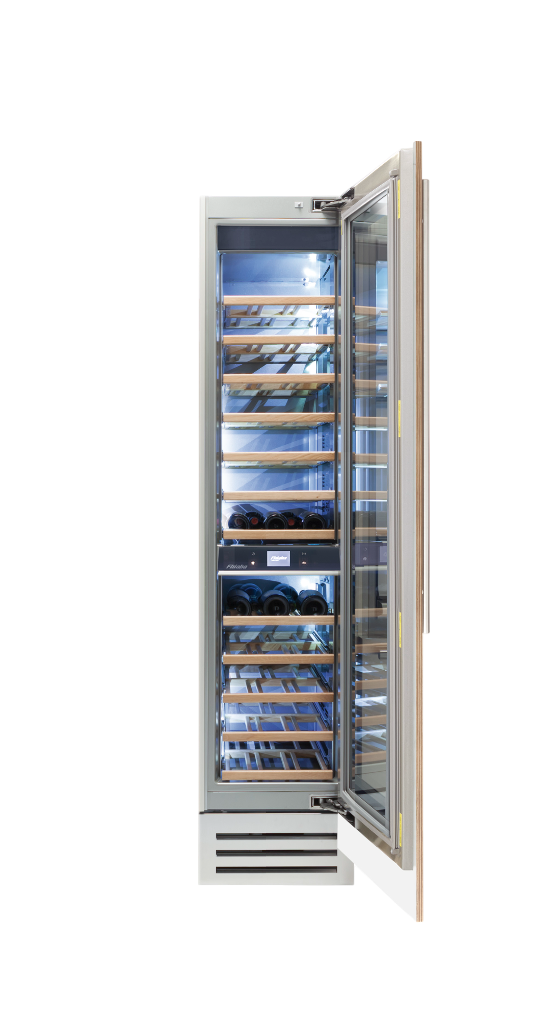 Le cantine vini Fhiaba sono dotate di pregiati ripiani in legno noce canaletto realizzati da artigiani friulani. Sfruttano ogni minimo spazio del vano e accolgono bottiglie con diverse dimensioni e sono completamente estraibili e dotati di chiusura soft per ridurre le vibrazioni.