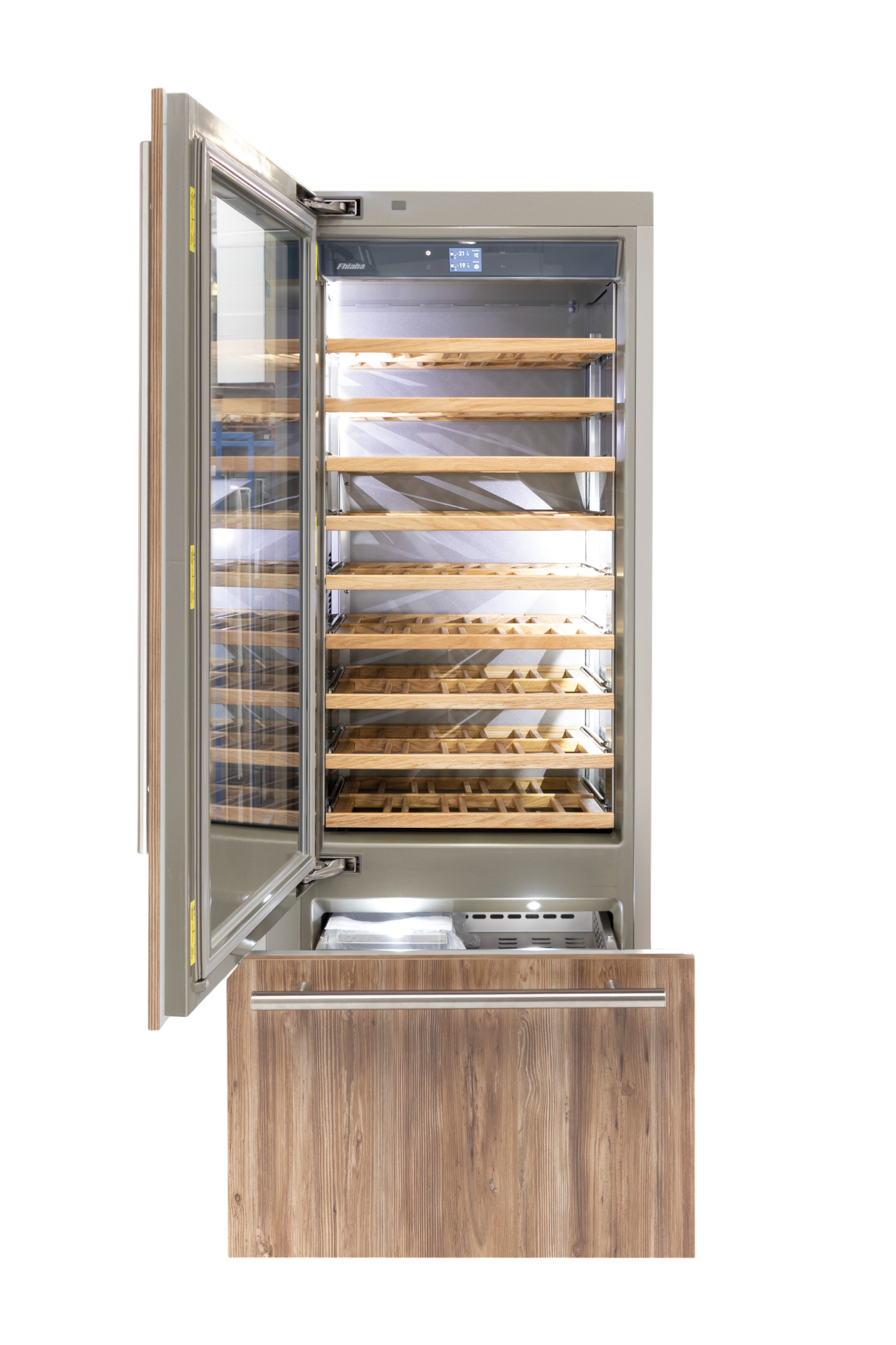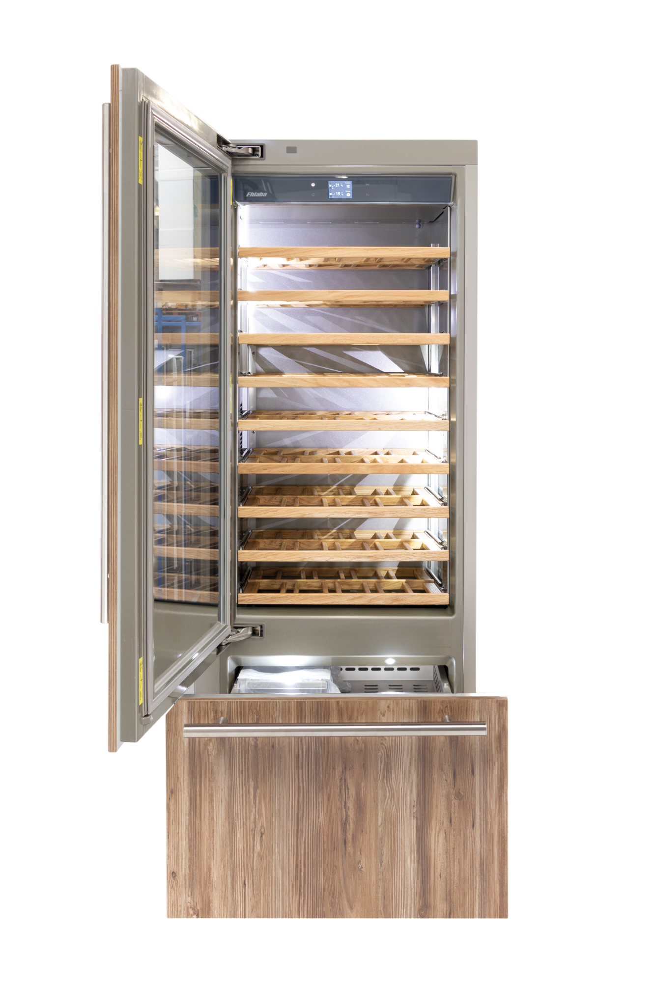 Le cantine vini Fhiaba sono dotate di pregiati ripiani in legno noce canaletto realizzati da artigiani friulani. Sfruttano ogni minimo spazio del vano e accolgono bottiglie con diverse dimensioni e sono completamente estraibili e dotati di chiusura soft per ridurre le vibrazioni.