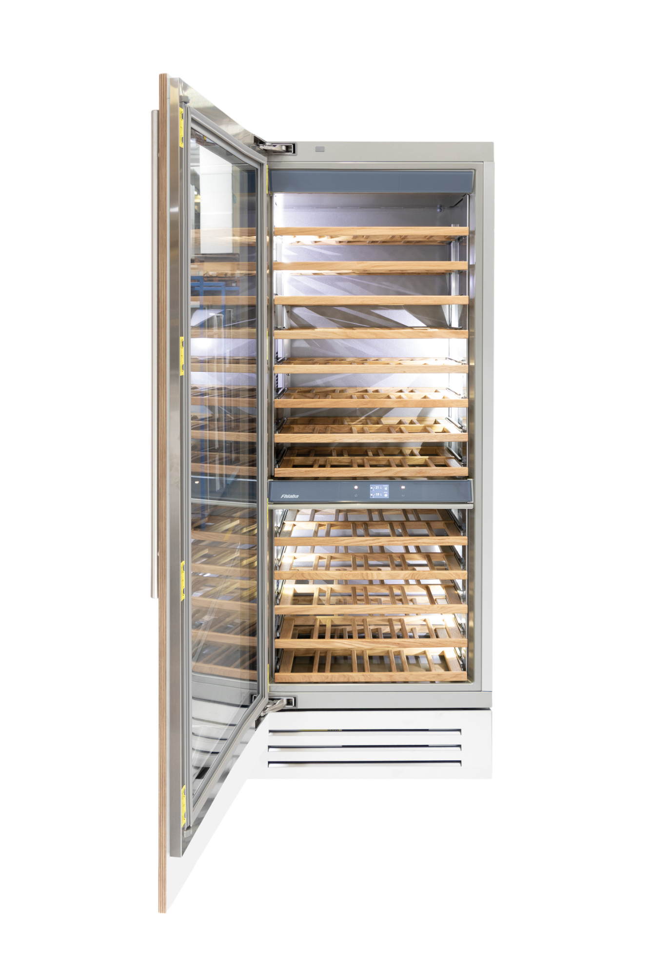 Le cantine vini Fhiaba sono dotate di pregiati ripiani in legno noce canaletto realizzati da artigiani friulani. Sfruttano ogni minimo spazio del vano e accolgono bottiglie con diverse dimensioni e sono completamente estraibili e dotati di chiusura soft per ridurre le vibrazioni.