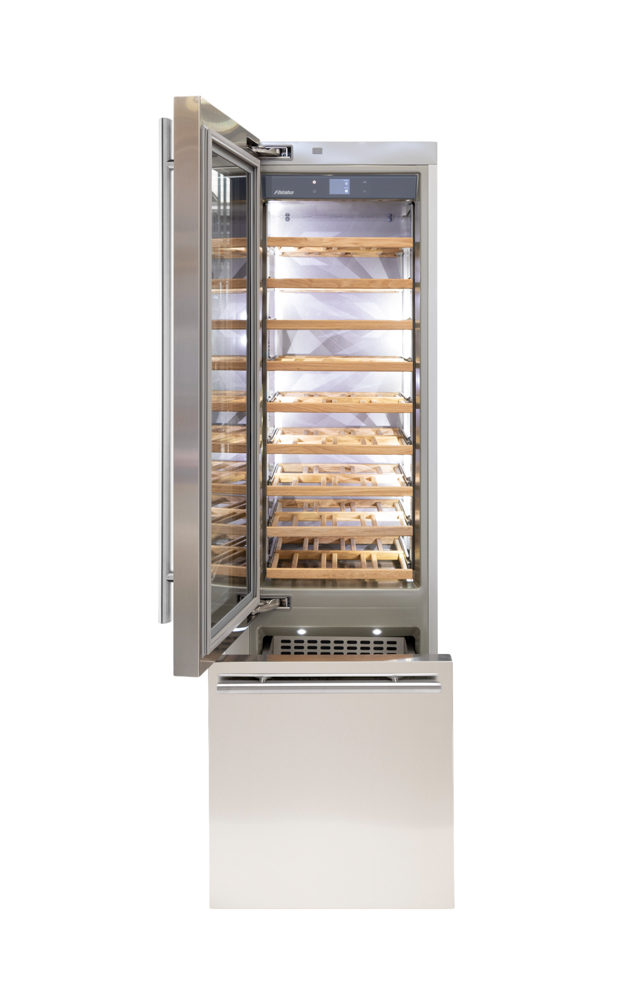 Le cantine vini Fhiaba sono dotate di pregiati ripiani in legno noce canaletto realizzati da artigiani friulani. Sfruttano ogni minimo spazio del vano e accolgono bottiglie con diverse dimensioni e sono completamente estraibili e dotati di chiusura soft per ridurre le vibrazioni.