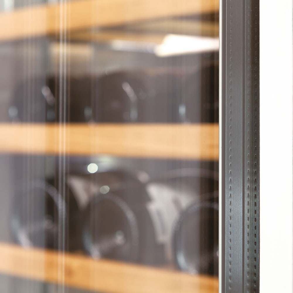 Le porte in vetro brunito Fhiaba hanno tre strati per filtrare i raggi UV e proteggere le bottiglie di vino dai epentini cambiamenti di temperatura e umidità dell'ambiente esterno.
