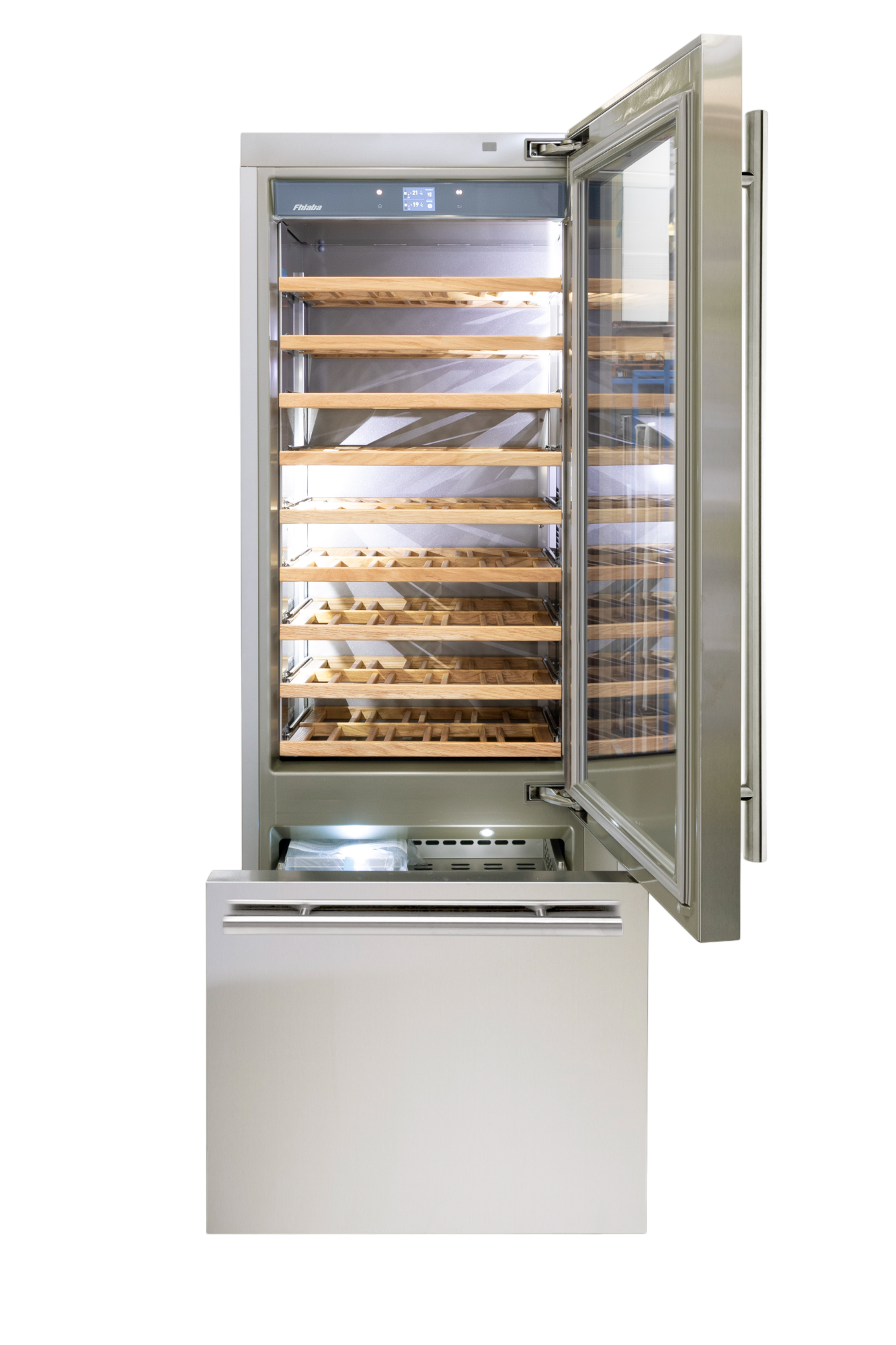 Le cantine vini Fhiaba sono dotate di pregiati ripiani in legno noce canaletto realizzati da artigiani friulani. Sfruttano ogni minimo spazio del vano e accolgono bottiglie con diverse dimensioni e sono completamente estraibili e dotati di chiusura soft per ridurre le vibrazioni.