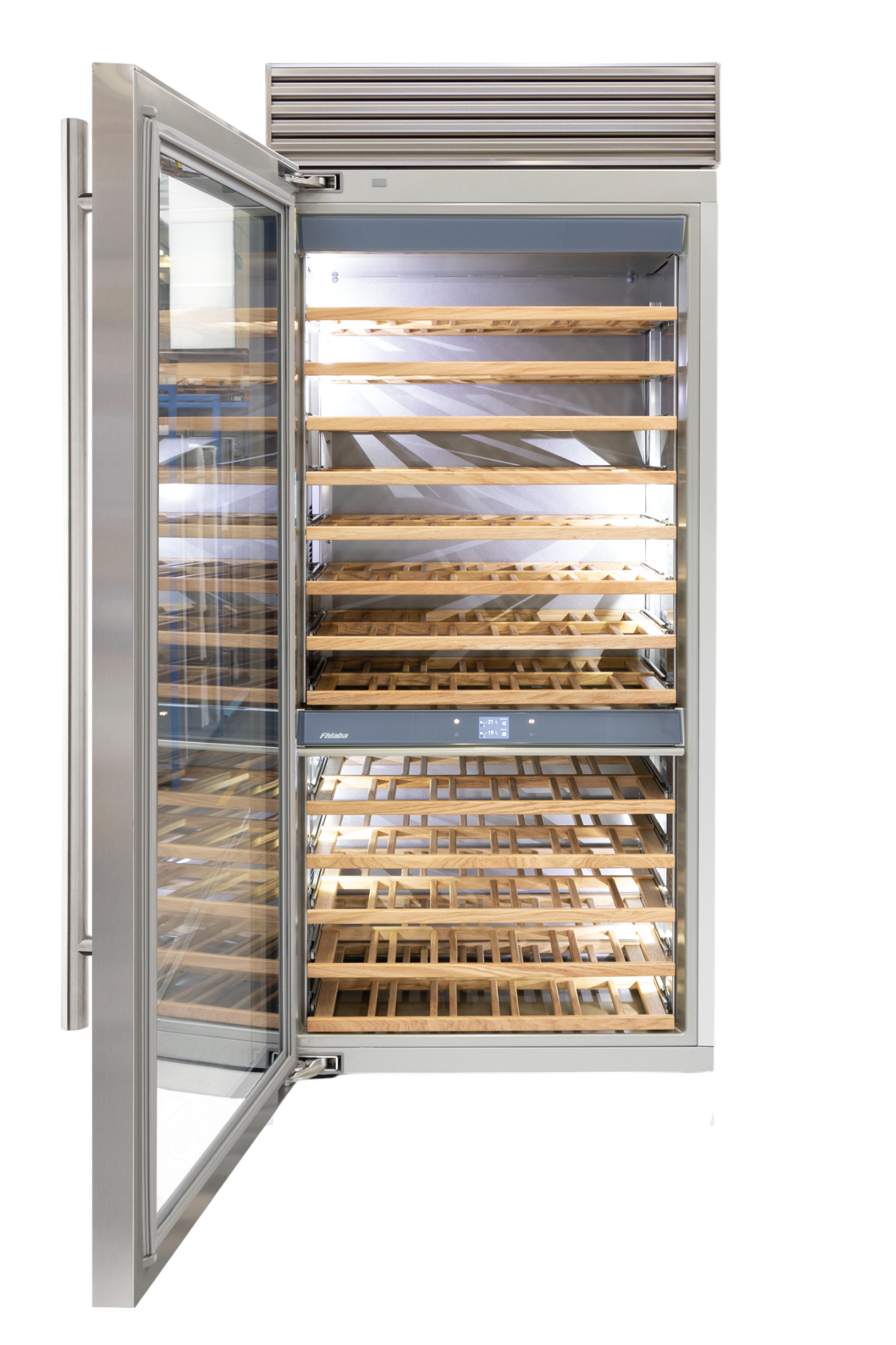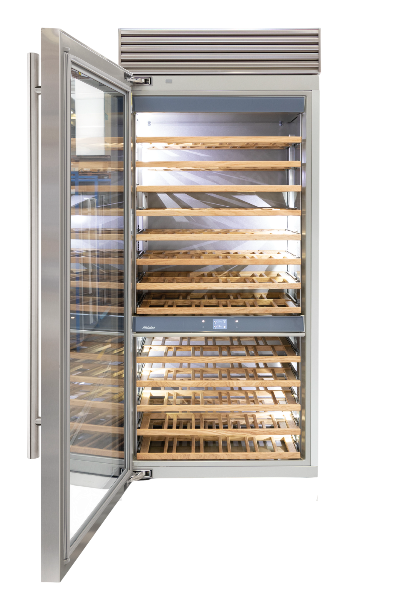 Le cantine vini Fhiaba sono dotate di pregiati ripiani in legno noce canaletto realizzati da artigiani friulani. Sfruttano ogni minimo spazio del vano e accolgono bottiglie con diverse dimensioni e sono completamente estraibili e dotati di chiusura soft per ridurre le vibrazioni.