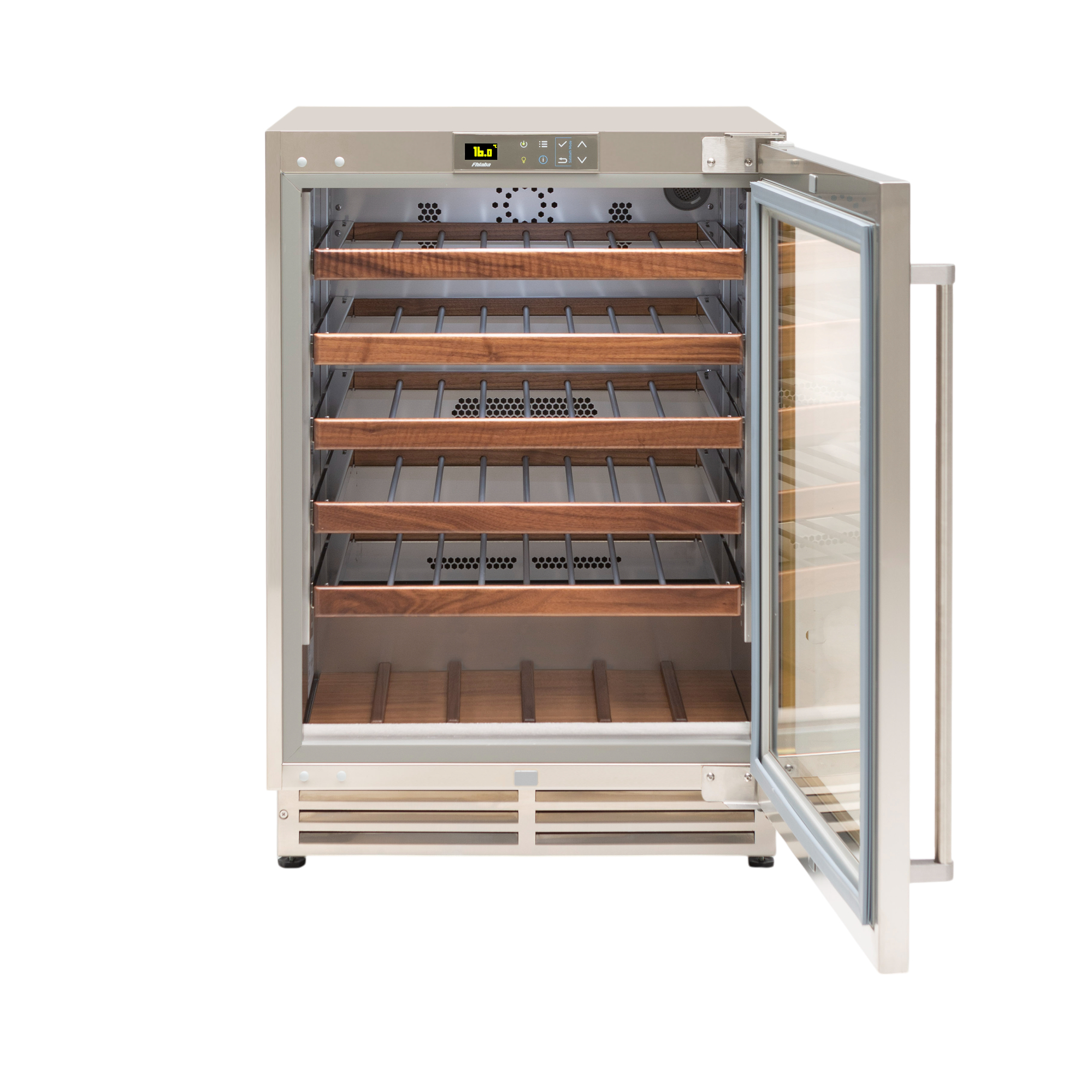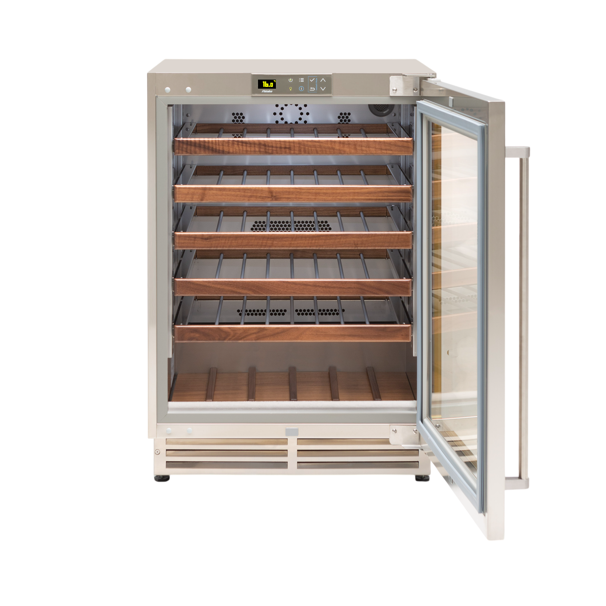 Il vano interno del modello beverage e della cantina vini può essere allestito in base alla realenecessità di conservazione. Sono disponibili ripiani in legno di noce canaletto per la collocazione delle bottiglie di vino e ripiani di vetro temperato con frontale in alluminio per posizionare bottiglie e lattine.