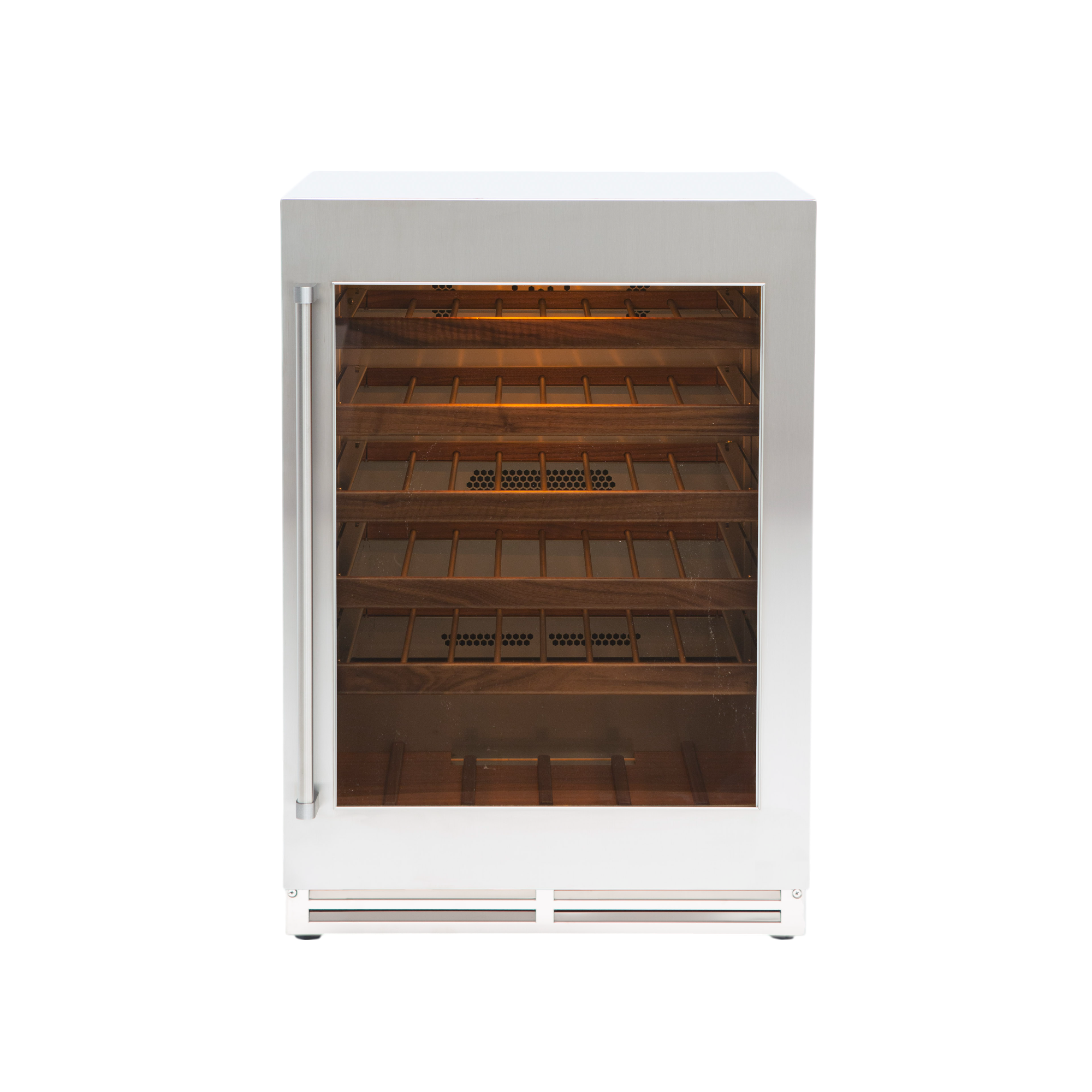 La porta con doppio vetro color bronzo e riempimento di gas Argon è altamente riflettente e permette di preservare la qualità del vino e di proteggerlo dal normale deterioramento. Le porte si chiudono in modo delicato. Innovativa tecnologia illuminazione LED ambra. La luce ambra non interagisce a livello molecolare con il vino, non contiene raggi ultravioletti e ha una ridotta emissione di calore. Con l’apertura della porta la luce diventa bianca.