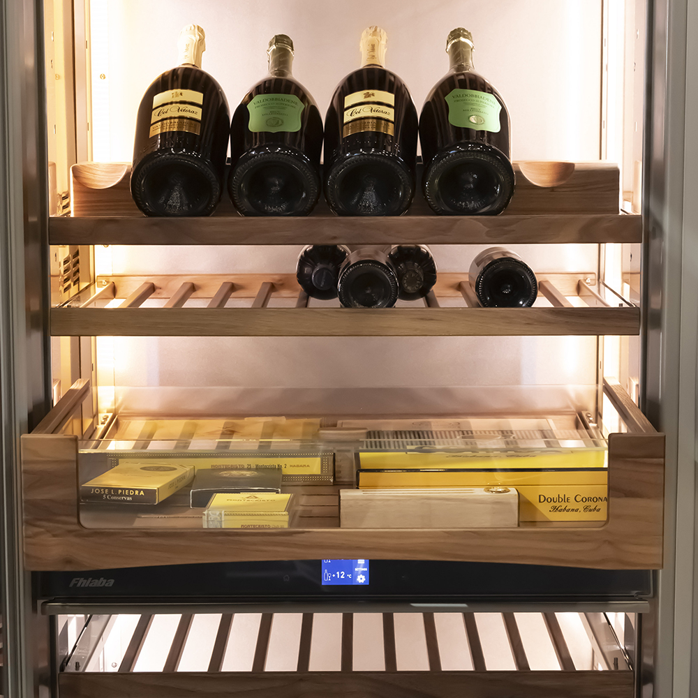 Supporto bottiglie in legno noce canaletto:8 bottiglie da 750ml oppure 4 bottiglie magnum, con cavatappi e 2 tappi stopper prestige
