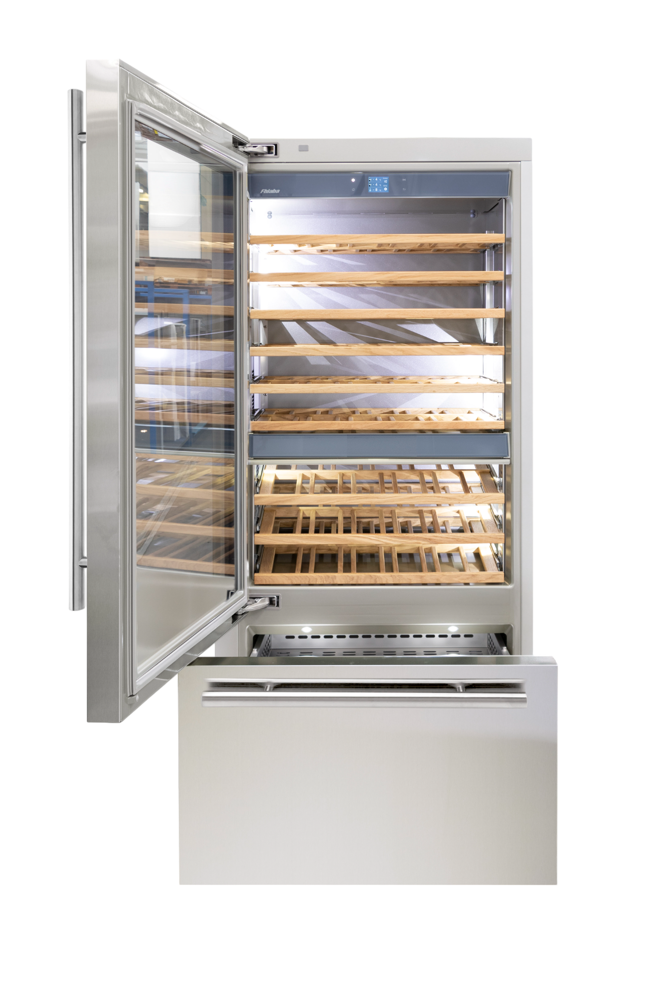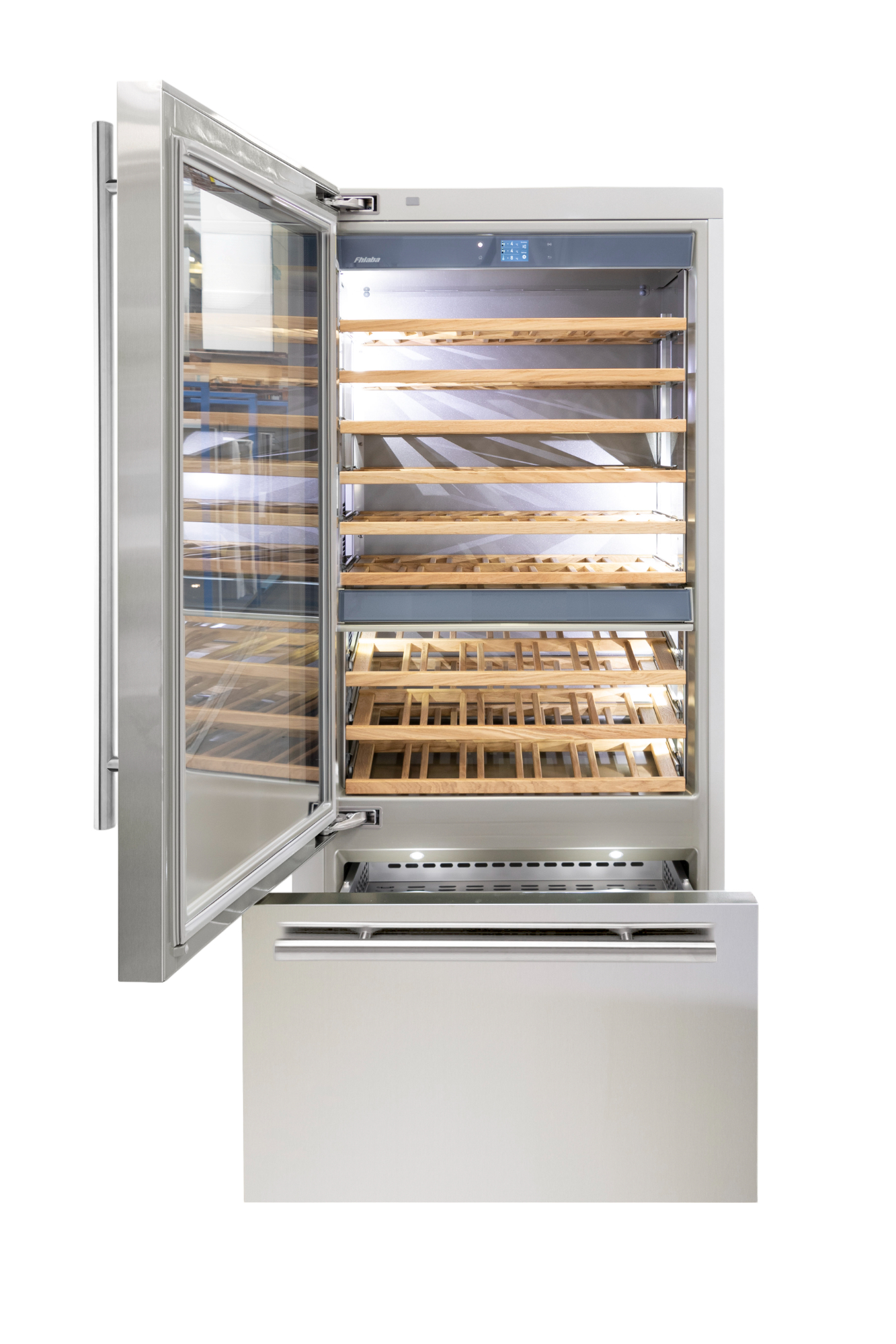 Le cantine vini Fhiaba sono dotate di pregiati ripiani in legno noce canaletto realizzati da artigiani friulani. Sfruttano ogni minimo spazio del vano e accolgono bottiglie con diverse dimensioni e sono completamente estraibili e dotati di chiusura soft per ridurre le vibrazioni.