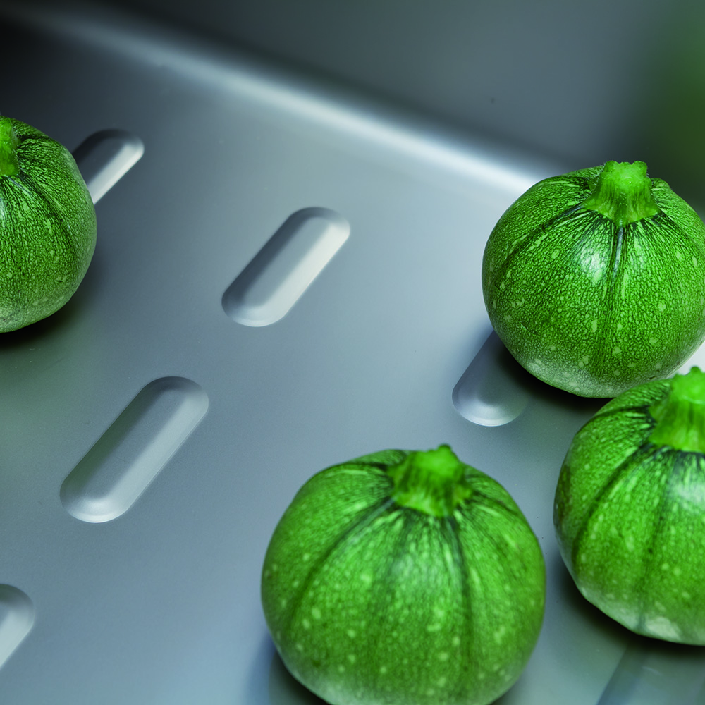 I cassetti in acciaio inox vengono trattati meccanicamente per raggiungere la “zero porosità” ed inibire la proliferazione batterica L’assenza di spigoli e fessure facilita la pulizia eliminando le zone non raggiungibili in cui si potrebbero depositare particelle di cibo.
