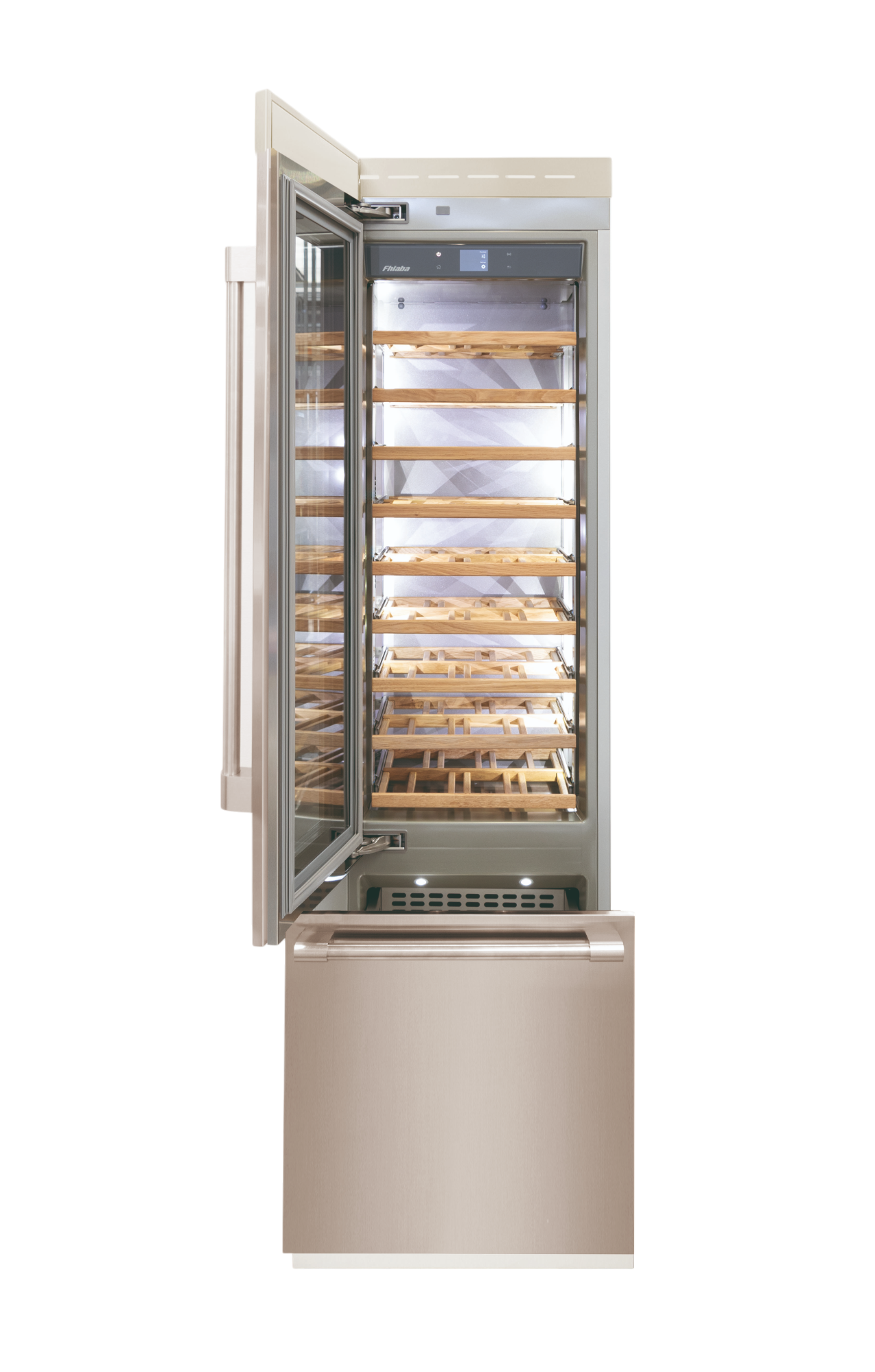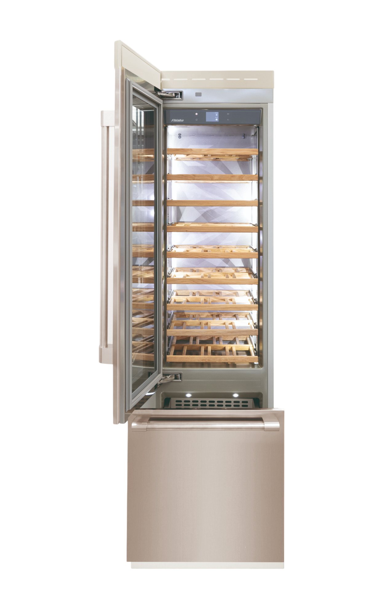 Le cantine vini Fhiaba sono dotate di pregiati ripiani in legno noce canaletto realizzati da artigiani friulani. Sfruttano ogni minimo spazio del vano e accolgono bottiglie con diverse dimensioni e sono completamente estraibili e dotati di chiusura soft per ridurre le vibrazioni.