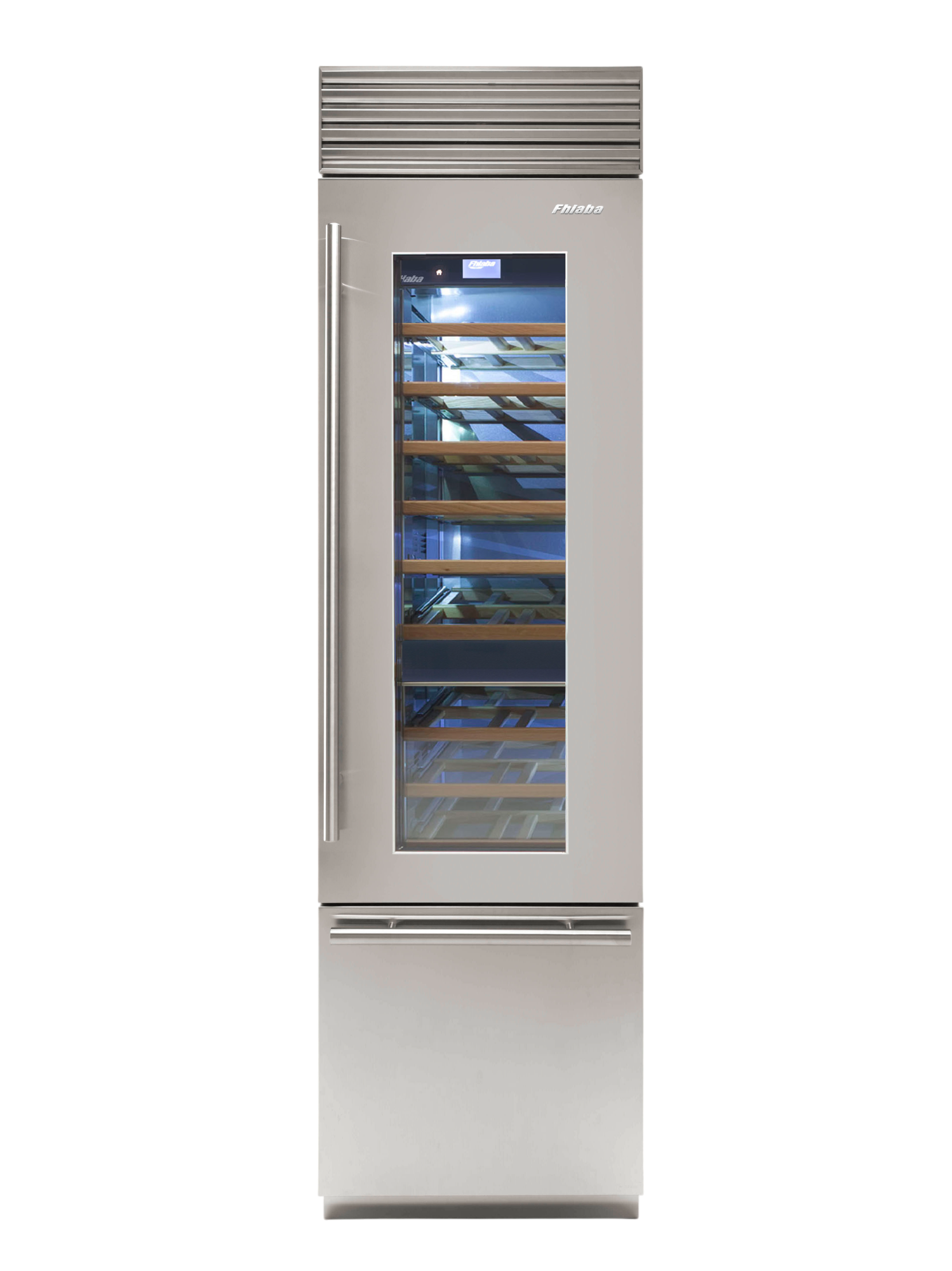 Le porte in vetro brunito Fhiaba hanno tre strati per filtrare i raggi UV e proteggere le bottiglie di vino dai epentini cambiamenti di temperatura e umidità dell'ambiente esterno.