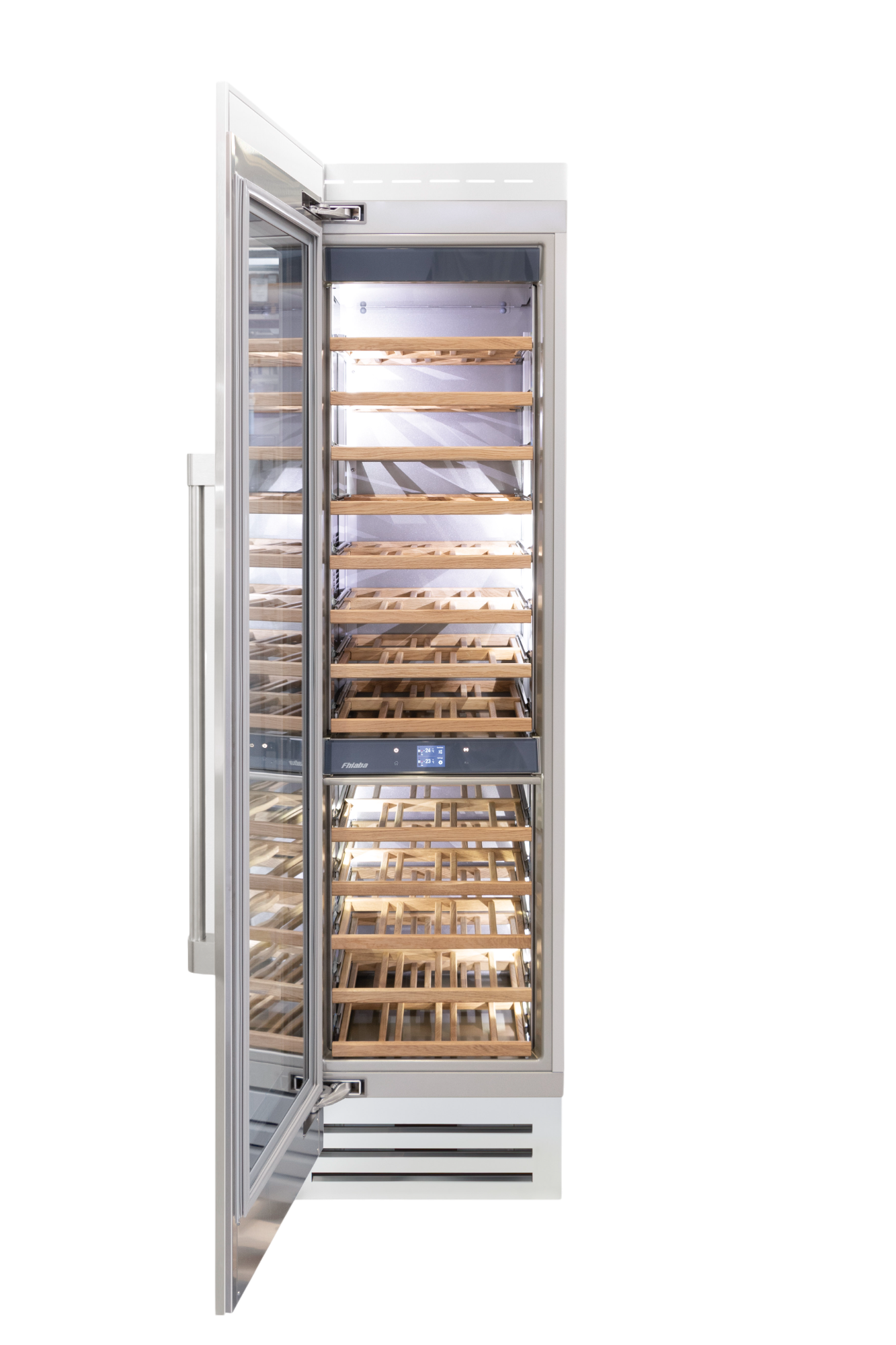 Le cantine vini Fhiaba sono dotate di pregiati ripiani in legno noce canaletto realizzati da artigiani friulani. Sfruttano ogni minimo spazio del vano e accolgono bottiglie con diverse dimensioni e sono completamente estraibili e dotati di chiusura soft per ridurre le vibrazioni.