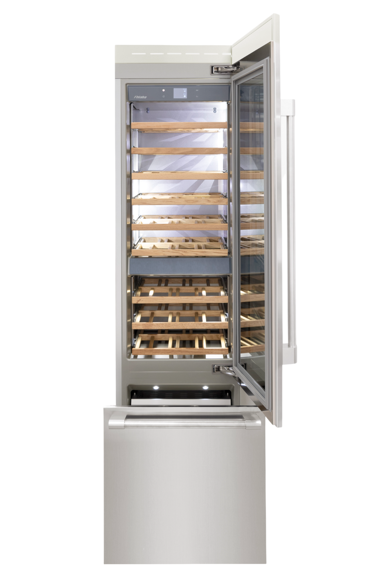 Le cantine vini Fhiaba sono dotate di pregiati ripiani in legno noce canaletto realizzati da artigiani friulani. Sfruttano ogni minimo spazio del vano e accolgono bottiglie con diverse dimensioni e sono completamente estraibili e dotati di chiusura soft per ridurre le vibrazioni.